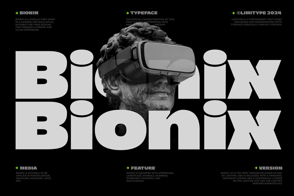 Bionix is a sans display font made with a bold and modern impression, equipped with inktrap which adds personality to this font. This font is suitable for designs that require a strong and clear impression when used in media but is still modern and fun. Bionix is suitable for headlines, posters, banners, logos, etc